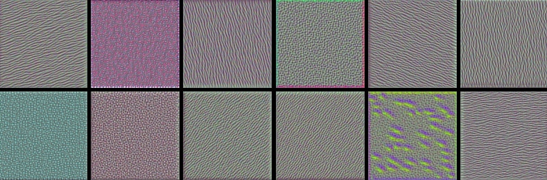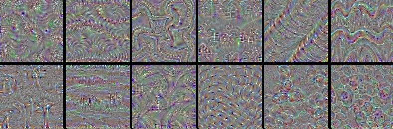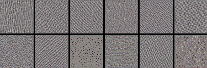Convolutional networks can be inspected by looking for synthetic input images \(\mathbf{x}\) that maximize the activation \(\mathbf{h}_{\ell,d}(\mathbf{x})\) of a chosen convolutional kernel \(\mathbf{u}\) at layer \(\ell\) and index \(d\) in the layer filter bank.